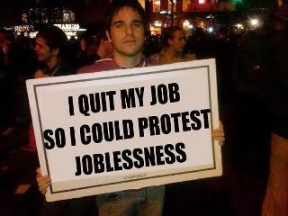 While this sign is funny, in a depressing kinda way, this protest isn't just about joblessness, which for some reason you guys seem to be focusing on. It's about how we're getting screwed at all levels by those in power and wealth and government. Yes, these people seem incoherent, discombobulated, and contradictory, but the message right now that is most important is that we're pissed off and we're doing something about it - the apathy is ending. These people aren;t just lazy, need-my-entitlements slobs, more and more poor used to be middle class. Capitalsim is all well and good as long as its fair, and the rules for too long now have benefited the Haves. Hop on the train already conservatives - we're doing what you tried to do and failed cuz you let the Reps co-opt your tea party and those you voted in to do something haven't done sh*t.