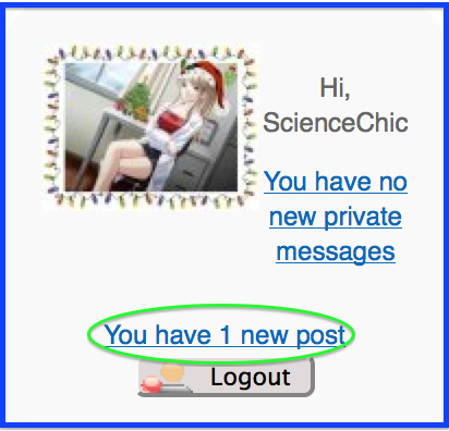 ScienceChic wrote: I happily admit I love this site, always have, all of it, and I selfishly want to see it grow (and I'd like to think all of you do as well). So for all of you that primarily hang out in here, I challenge you to broaden your horizons: for every post you put in this forum, you have to put a post in any other forum here. (see what I'm doing there? heehee #shamelesssitepromotion)
