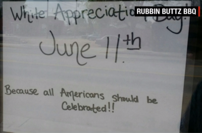 A sign posted in the restaurant's window announcing "White Appreciation Day" on June 11 reads, "Because all Americans should be celebrated."