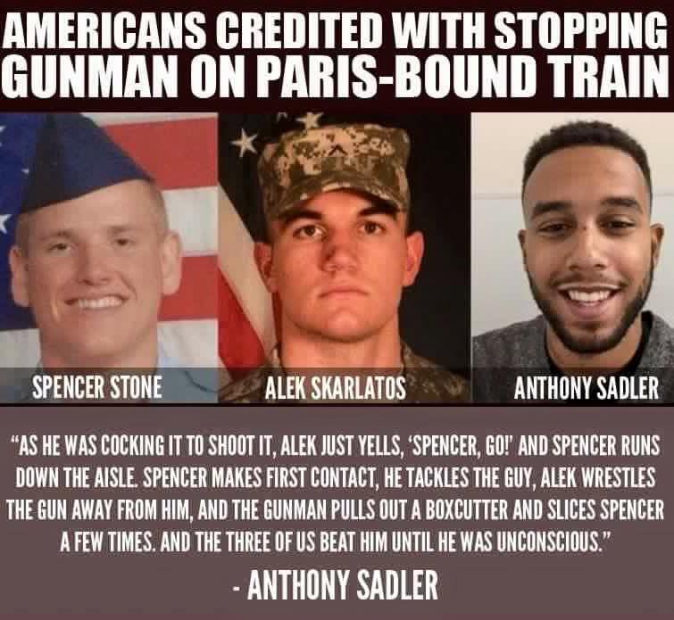 Airman 1st Class Spencer Stone, National Guardsman Alek Skarlatos and their civilian friend Anthony Sadler were on the Amsterdam-to-Paris train Friday when a gunman, who had already fired a shot in another car, came into their carriage.