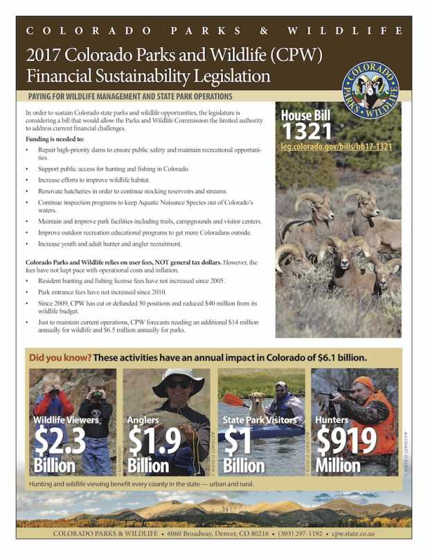 CPW is an enterprise agency that typically receives no general fund dollars (income and sales tax dollars). CPW relies on revenue from hunters, anglers and park visitors to cover its expenses. State and federal law mandates that funding for wildlife management and for the park management within the agency remain completely separate. H.B. 17-1321, sponsored by Representative Arndt, Wilson, Catlin, Rankin, McLachlan, and Mitsch Bush, would provide the 11-member Parks and Wildlife Commission - which governs the agency - with authority to set parks, hunting and fishing fees within a legislatively mandated cap. Giving the Commission the ability to set and adjust fees will allow CPW to cover the rising costs associated with managing wildlife, protecting habitat and maintaining and improving parks in our fast-growing state.