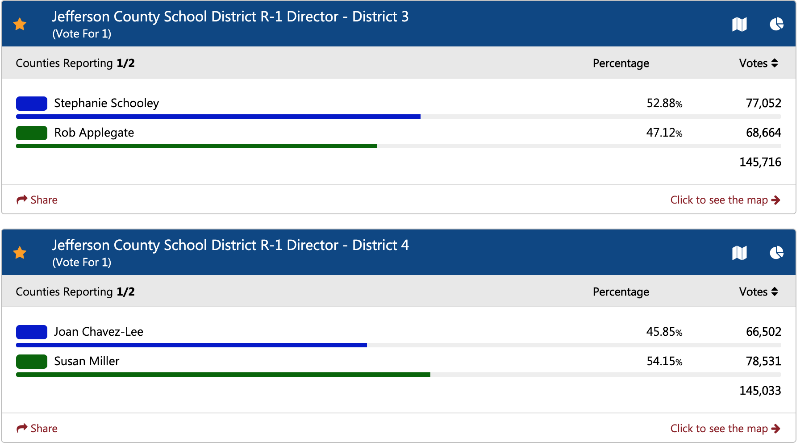 Stephanie Schooley and Susan Miller hold leads for the Jeffco School District 3 & 4, respectively (52% and 55% over their opponents)