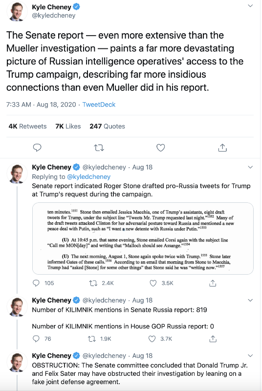 That then-campaign chairman Paul Manafort was working with Konstantin Kilimnik, a Russian intelligence officer, and sought to share internal campaign information with Kilimnik. The committee says it obtained "some information suggesting Kilimnik may have been connected" to Russia's 2016 hacking operation and concludes Manafort's role on the campaign "represented a grave counterintelligence threat."