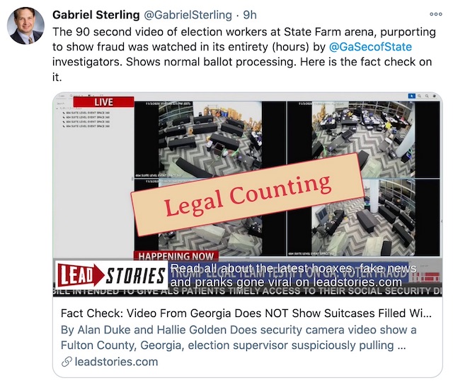 I watched the video, and it appears that the time stamp says November 3, which is the day of the election. What I don't hear in that video is any evidence of voter fraud. I don't understand why they asked everyone to leave, and appeared to keep counting, but this would've been the original counting of the ballots, correct? So if there was a discrepancy between the initial machine and the audit conducted by manual hand-count, then I would agree that there is something wrong. However, the hand tabulation matched the results of the machine count and was certified by the [Republican] Secretary of State. I have yet to see any evidence of ballot manipulation removing votes for Trump or adding votes for Biden.