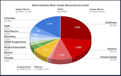 The 1922 Colorado River Compact called for dividing the river’s water equally between the Upper Basin (Colorado, northwestern New Mexico, Utah, Wyoming and far northeastern Arizona) and the Lower Basin (California, Nevada, the rest of Arizona, southwestern Utah and western New Mexico). In the compact, each basin was promised 7.5 million acre-feet of water each year. (An acre-foot is 325,851 gallons, enough to cover an acre, about the size of a football field, 12 inches deep.)