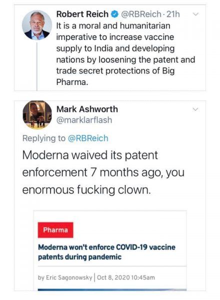 There are a couple of reasons this is a bad idea. It discourages pharmaceutical companies to develop new vaccines if their work is stolen by government mandate. And consider this, would people have even less trust in Covid-19 vaccines is they knew that governments and companies who hadn't developed them were now producing them?