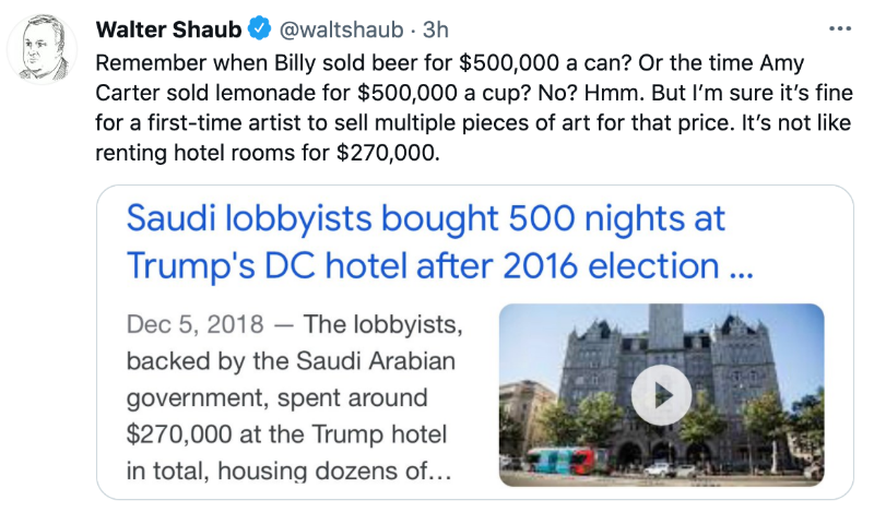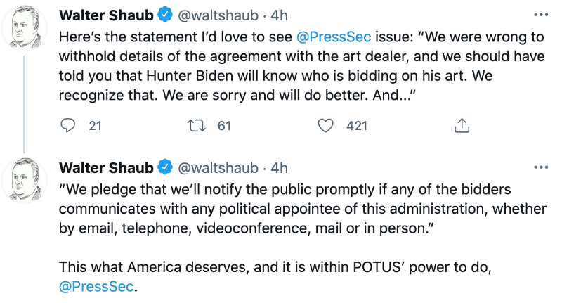 Hunter Biden's art sales are an ethical outhouse. Of course he's profiting off of his name, and there needs to be greater transparency as to who's buying and what they get from it. There should be absolutely no connection through to the WH, but we don't know that there isn't because nothing has been made public. Our POTUS has a huge blind spot when it comes to his loser son, and I understand and sympathize with why, but he needs to do better than that.