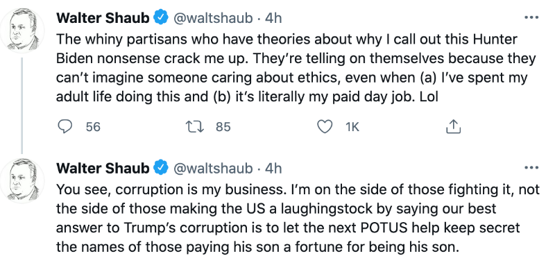 then you should go back and reconsider your stance on all that. If you're okay with what Hunter is doing but criticized the Trump kids, same thing. Walter Schaub has at least been consistent and held both administrations to the same ethical standards - that's a trustworthy source to follow.