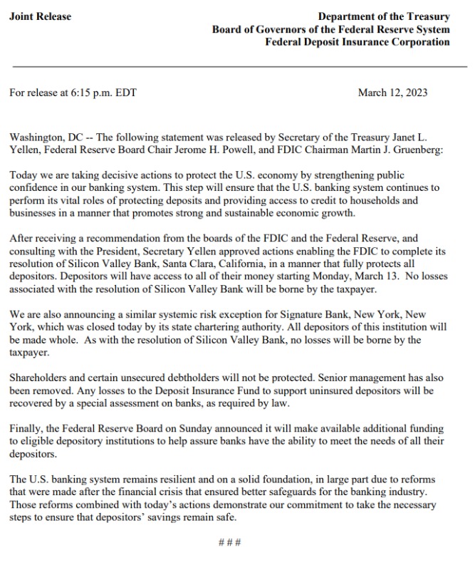 "Yellen approved actions enabling the FDIC to complete its resolution of Silicon Valley Bank, Santa Clara, California, in a manner that fully protects all depositors. Depositors will have access to all of their money."