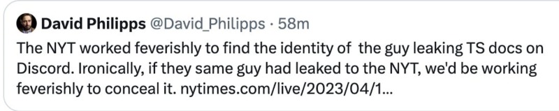 Interesting, when Ellsberg, leaked the Pentagon Papers to the NYT, the Times went into full legal defense. Now that the Times did not get this story, and they ardently support the war in Ukraine , NYT had no problem assisting the government in exposing and arresting the leaker.
