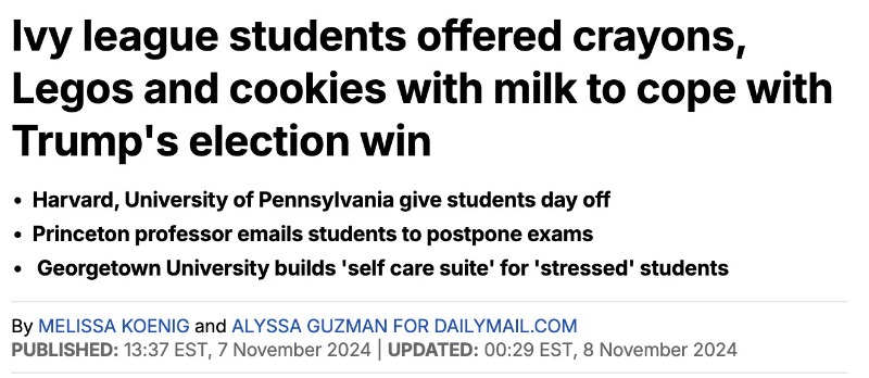 In what seems to be a universal, dare I say collective, response to the election, Democrats are asking what is wrong with the people of the Union, not what's wrong with their policies, that led to the citizens of these United States deciding that a man, that according to the collective, is a racist, misogynist, fascist felon who has been found liable for sexual assault and libel, would serve this country better than the candidate they hand picked to run against him.