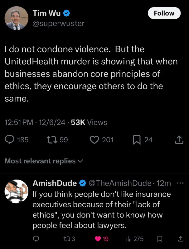 Given they are still looking for a suspect in the shooting, and therefore the political leanings of same can't be known, isn't it a bit early to be presupposing the murderer is a leftist and the shooting is the result of election losses as opposed to, oh, I don't know, someone who lost a loved one to an illness that United Healthcare refused to cover and the bereaved blamed the CEO for the loss of the one they loved?