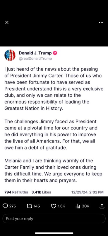 Carter was a good man and deserves to be honored. He wasn't a great president imo, but compared to Biden, he looks like Washington. Carter didn't use his influence to scoop up millions from corrupt and enemy countries, and unlike the Obama's, he decided to help people instead of helping themselves to riches they think they deserve. Nope, Carter was the first and last Democrat president (in my lifetime) to NOT use his position to enrich his family.