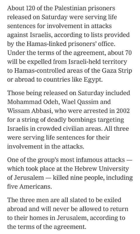 Israelis always surprise me with their anti-terrorism ingenuity. The exploding pagers were a brilliant idea made the scumbags worry about boobytraps all around them. I wouldn't be surprised if some sort of tracking devices were implanted in those terrorists after being drugged. Yeah, I know that sounds crazy, but the Jews have lived their whole lives trying to figure out how to survive. If the released prisoners start vanishing or end up being taken out, mysteriously...