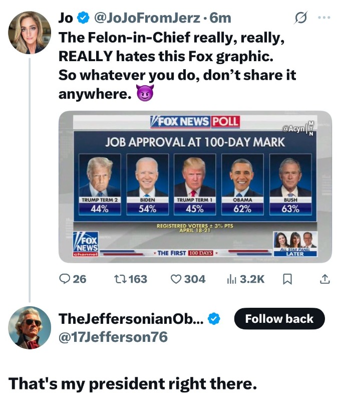 And this is a Democrat source. QUOTE......I'M, SORRY, PERHAPS U HAVE OVERLOOKED THE FACT THAT TRUMP'S SECOND TERM IS ONLY 100 DAYS OLD...AND HIS RATING IS ABYSMAL , HE STILL HAS MANY MORE MONTHS IN THIS TERM, WHAT DOES THAT TELL U ABOUT THE STAT U JUST QUOTED?.....IT TELLS ME HIS CHAOTIC CHOICES R TAKING A TOLL AND HIS PROMISES TO THE MAGA HAVE GONE OFF THE RAIL. AS A SIDE NOTE, MY SIL WAS HARD CORE TRUMPER, I JUST TALKED TO HER LAST NITE....FOR A VERY LONG TIME.