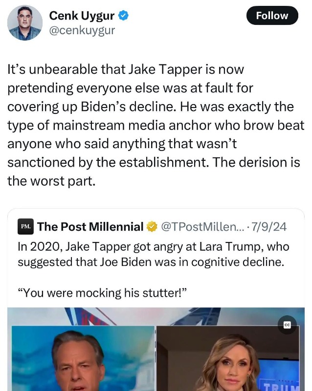 Tapper is the same kind of POS as the rest of the media HA has been trusting for years. The fake journalists are bad, but the fools that always believe them are just as bad. They all act like they had no idea Biden was brain dead, even though people like me knew otherwise because we were actually exposed to the truth... unlike HA who was exposed to bullshit..