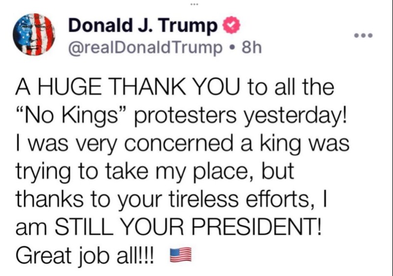 Well, I have to say that the collectivist elite sitting in chambers crafting the messages they wish to disseminate to the populace has a ring of a royal air to it. I mean, truly, Hillary posting about no kings while she, Schumer, and a host of others are attending the wedding of Hillary's "2nd daughter" to the son of the "king-maker" Soros? Not to mention . . . though I will . . . how the Democrats have gone out of their way to anoint a presidential candidate in each of the last 3 elections to the consternation of other potential candidates and their constituents. Sounds like there's one party that believes in a royal succession . . . do the Democrats even have a concept of hypocrisy or is it something they only accuse the political opponents of.