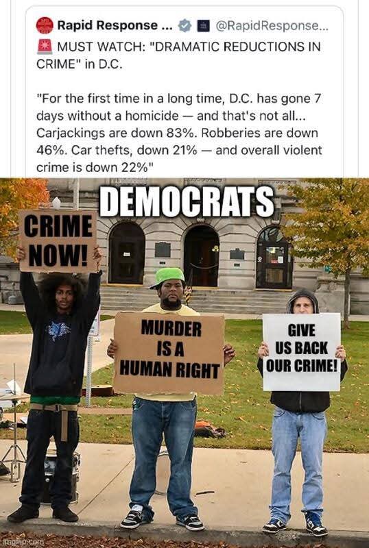 I wonder what the residents of DC think about the cleanup of crime? They just had their first murder free week... no big deal if you live in a mountain community, but imagine if you were in that city and were always afraid to walk the streets after dark. I think the 95% Democrat stat is going to start shifting to the right as those residents get a taste of what real leadership looks like... what protecting citizens looks like.
