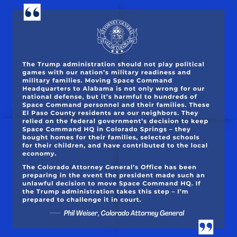 "the federal government's decision" was made contrary to the original decision during the first Trump administration. All Trump is doing is reinstating the original federal government decision to locate the Space Command headquarters in Huntsville where it would be close to the Army's Space and Missile Defense center as well as a NASA flight center that Biden reversed as a thank you for the loyal support of the Democrats in Congress from Colorado and Polis.