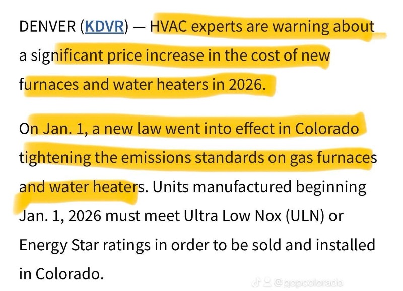 Governor Polis and the Deep Blue Colorado legislature have chosen to listen to environmental whackos and now new furnaces will bear the "California Approved" stamp.