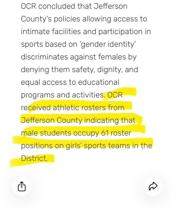 The above link shows that 61 men are filling roster spots on female sports teams in Jeffco. In the post the OCR referred to is the Office of Civil Rights.